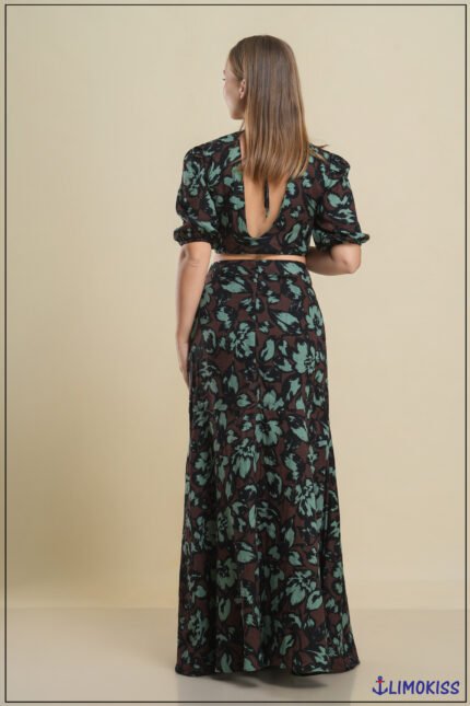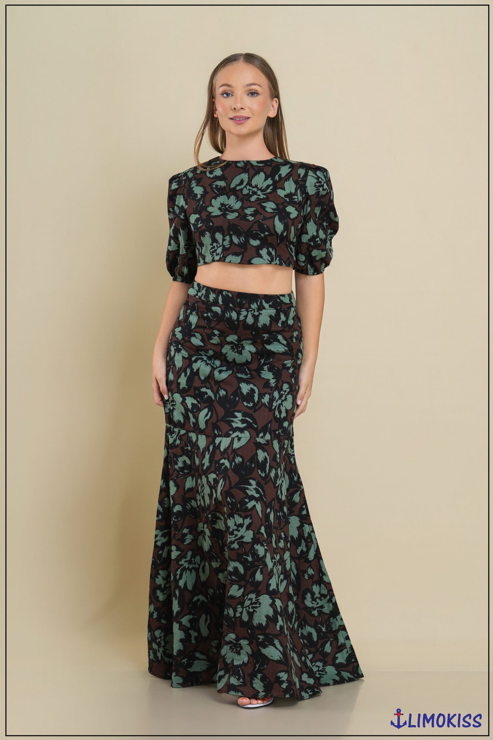 Step into elegance with this floral crop and skirt set. The puff-sleeve crop top brings a trendy flair, while the matching high-waist flared skirt adds a graceful finish. Designed with a bold floral print, this set is perfect for making a statement whether at a party, evening outing, or special occasion.