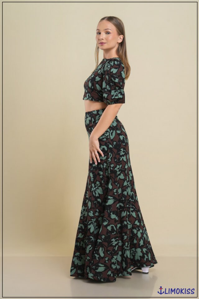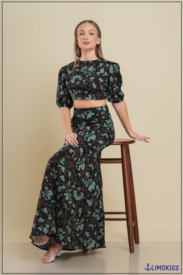 Step into elegance with this floral crop and skirt set. The puff-sleeve crop top brings a trendy flair, while the matching high-waist flared skirt adds a graceful finish. Designed with a bold floral print, this set is perfect for making a statement whether at a party, evening outing, or special occasion.