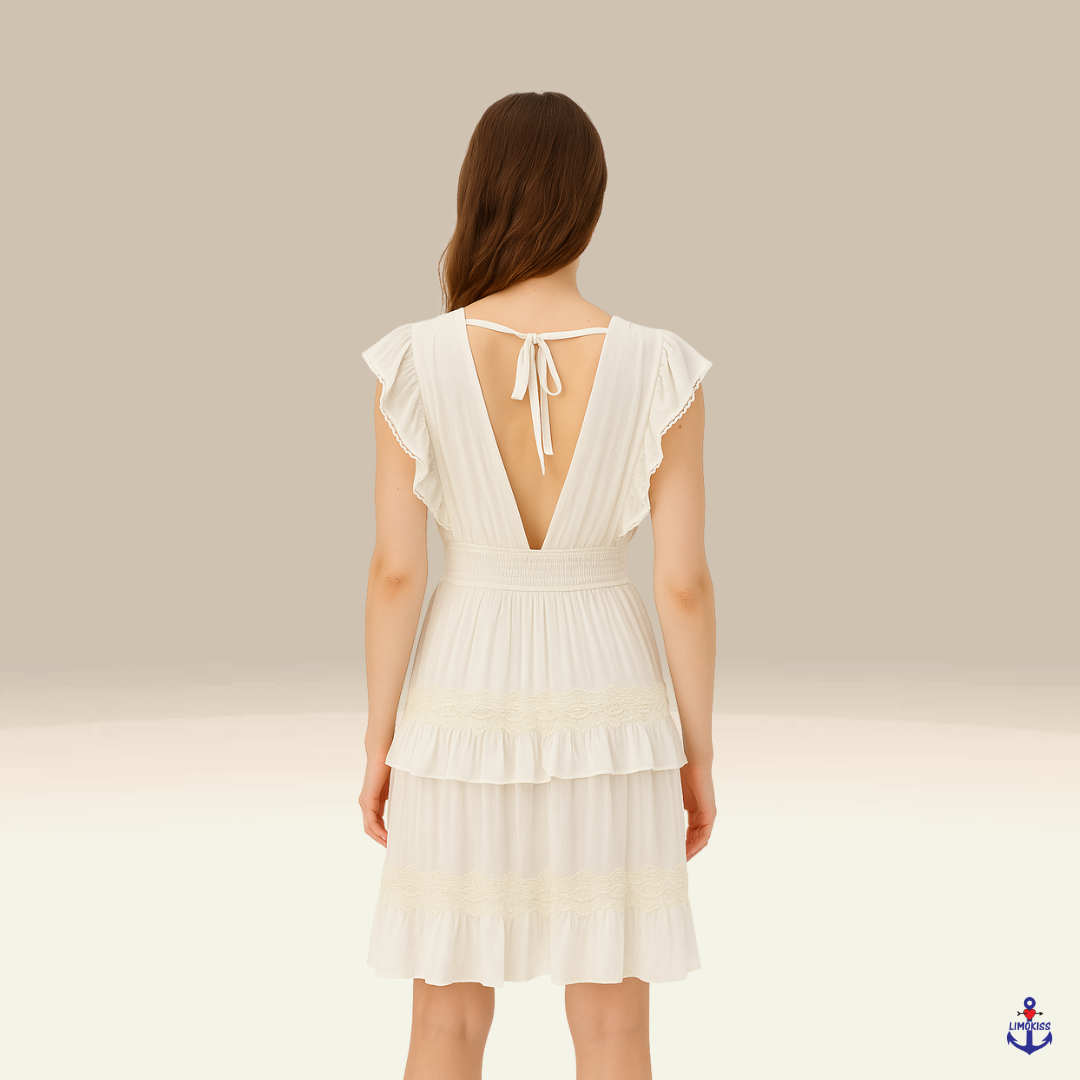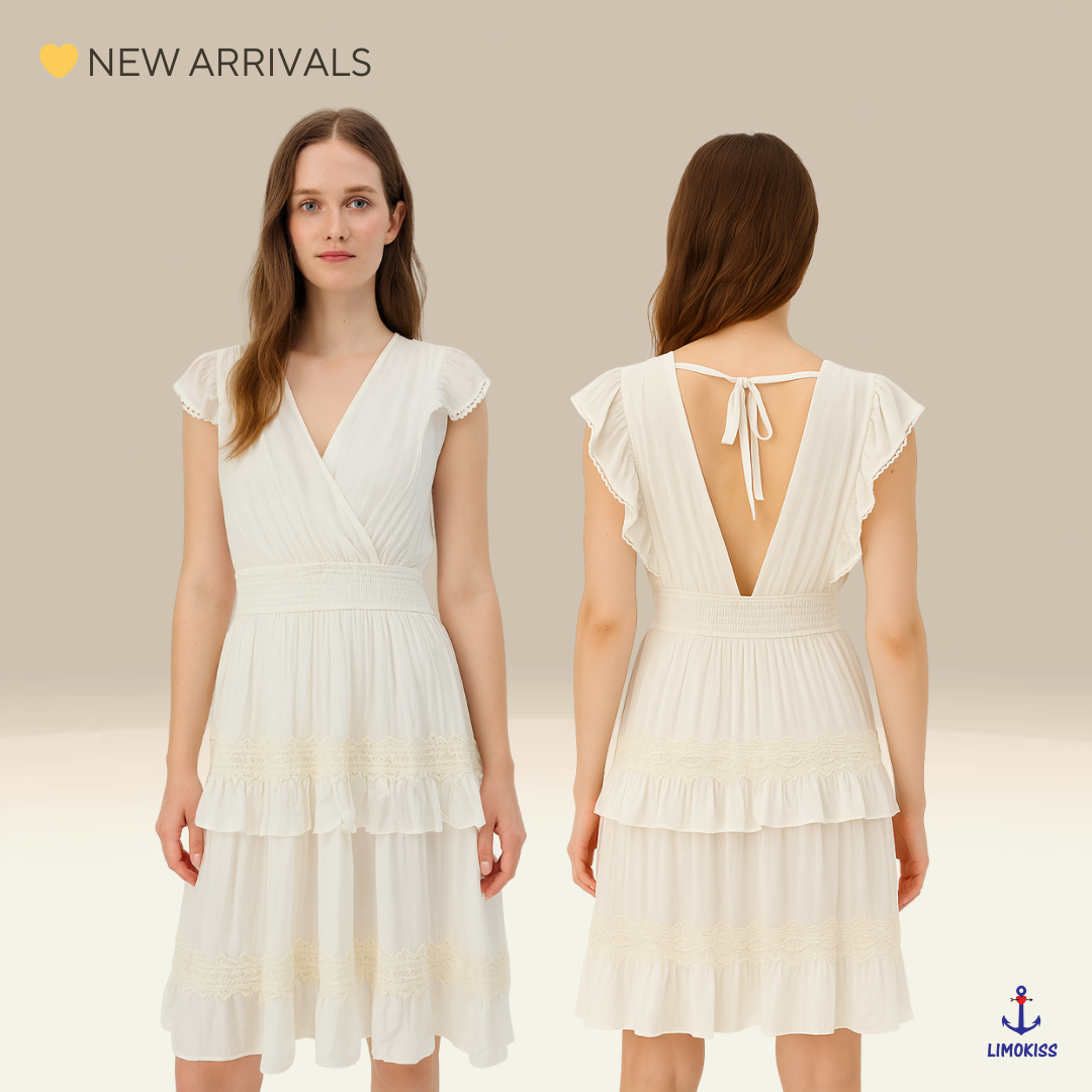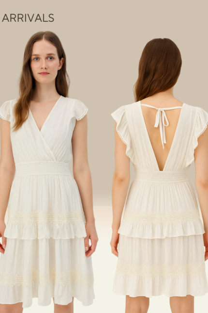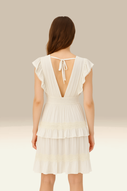 This elegant ivory dress features a soft V-neck wrap bodice and flutter sleeves that add a light, feminine touch. The smocked waist creates a flattering shape, while the tiered ruffle hem gives the dress a graceful flow with every step. The back showcases a deep V-cut with a delicate tie detail, balancing coverage with a stylish open-back design. Made from lightweight, breathable fabric, this dress offers comfort for all-day wear.