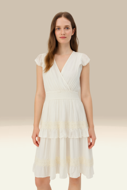 This elegant ivory dress features a soft V-neck wrap bodice and flutter sleeves that add a light, feminine touch. The smocked waist creates a flattering shape, while the tiered ruffle hem gives the dress a graceful flow with every step. The back showcases a deep V-cut with a delicate tie detail, balancing coverage with a stylish open-back design. Made from lightweight, breathable fabric, this dress offers comfort for all-day wear.