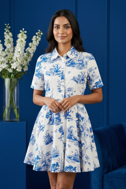 Wash Care: To keep your Toile Print Cotton Shirt Dress looking brand new, we recommend a gentle cold machine wash. Use a mild detergent to preserve the deep blue pigments of the print. Hang to dry in a shaded area to protect the cotton fibers from sun damage. This fabric is easy to iron, ensuring you can achieve a crisp, professional look in minutes.