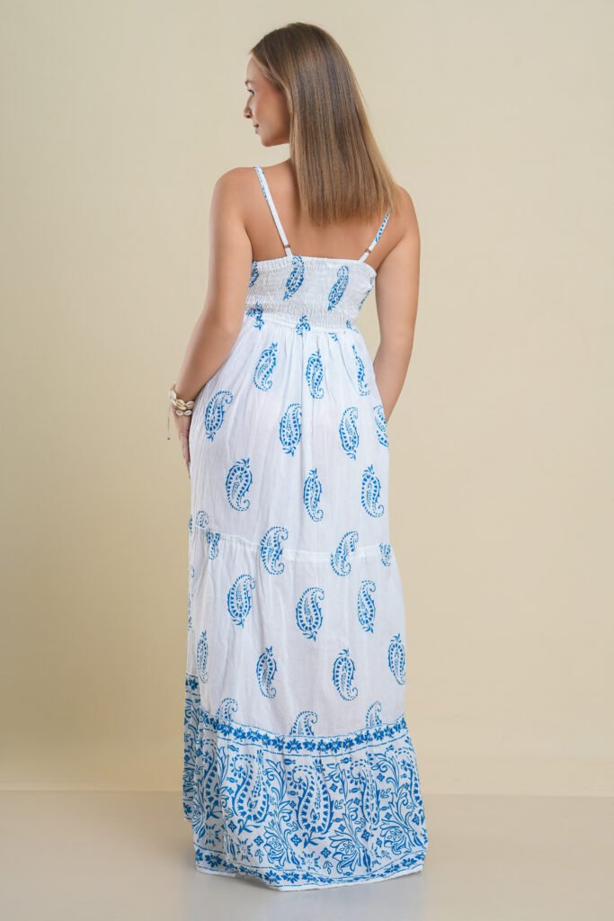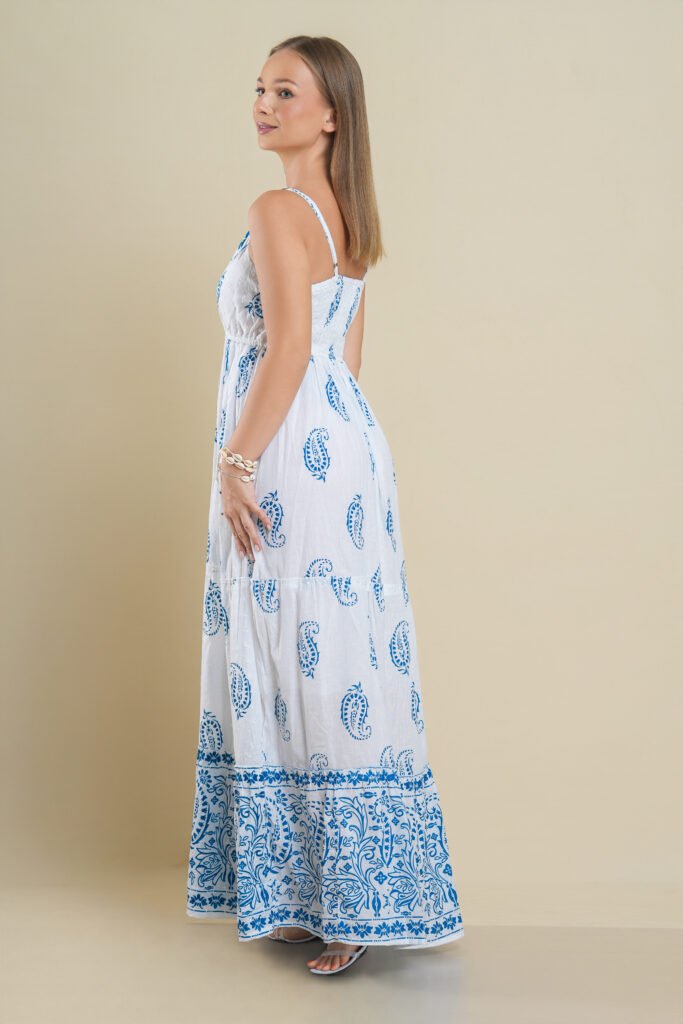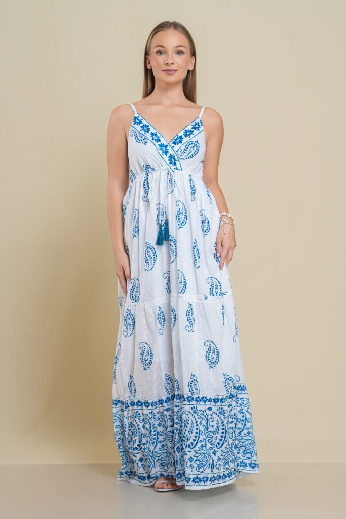 This beautiful white dress features delicate blue paisley and border prints that capture the essence of tropical days. The V-neckline and adjustable shoulder straps create a flattering fit, while the tie-front waist adds a touch of definition to your silhouette. Lightweight and breathable, it’s your go-to choice for both casual brunches and holiday getaways.